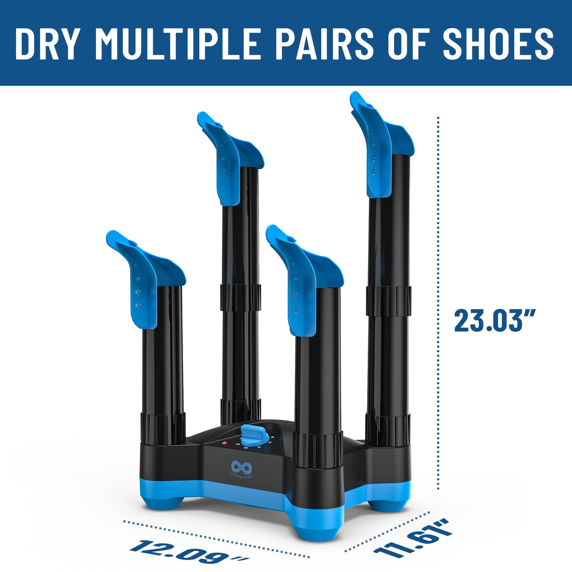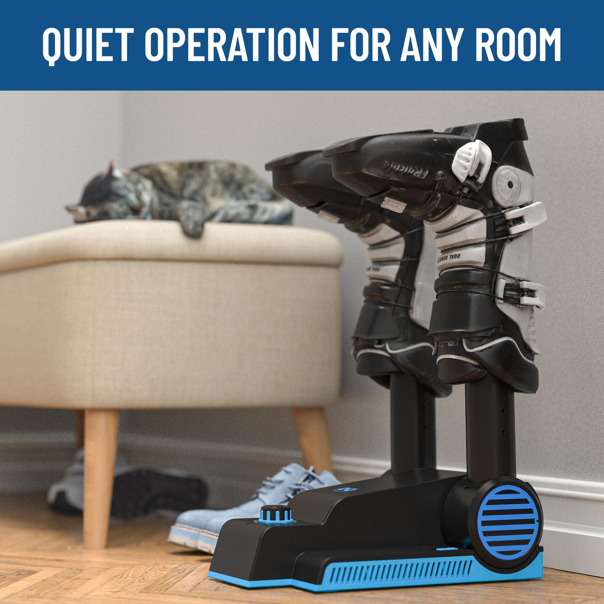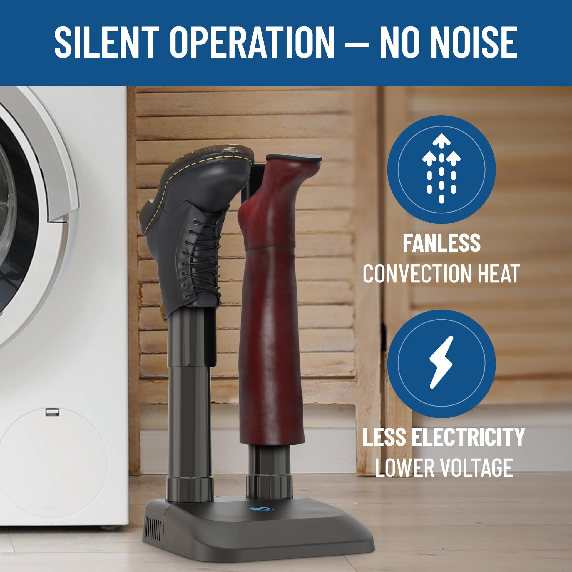 - SILENT & EFFECTIVE DRYING SYSTEM: Designed with convection heat, this boot dryer silently dries one pair of shoes, boots, or sneakers at a time without loud noise. These fanless shoe dryers for sneakers, boots, sports footwear, and winter gear circulate warm air gently and evenly and work overnight, protecting materials from over heating, shrinking, or cracking. This portable shoe drying rack can be used for the whole family.
